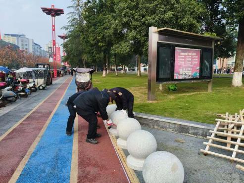 整治期间,组建专职巡查队,实行“早7点至晚9点”全时段值守。针对车辆闯入、乱停乱放等行为,创新“三步工作法”,首次发现进行文明劝导,二次违规实施教育警示,屡教不改者依法处罚。行动以来累计劝导规范停车1200余次,日均处理量超百次,实现广场内“零违规车辆”目标。针对夜间噪音问题,通过“定点值守+机动巡查”模式,确保21:00前广场活动有序退场,化解噪音纠纷。专项整治以来,共劝离游商40余起,完成周边路缘石及市政设施修补工程,修复破路沿石4根、破损U型管3根、雨篦子4处,消除安全隐患15处。