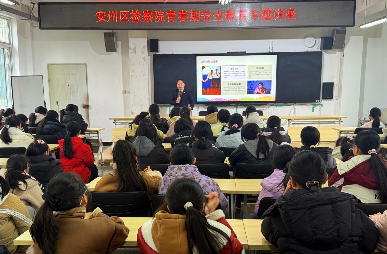 1月7日,绵阳市安州区检察院“熊猫未士·法之翼”未检团队成员、河清小学法治副校长杨曦走进该校,为学校女生送上了一堂“青春期安全知识”专题讲座,为女生们送上了实用的安全防护“指南”。