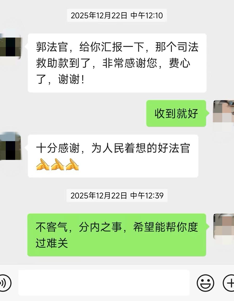 近日,一条来自申请执行人的微信消息发送到乐山市沙湾区人民法院执行干警郭照的手机上,简短的文字背后,是当事人张某对司法温情的深深感激。这笔2万元的司法救助金,不仅为陷入困境的家庭送去了“及时雨”,更彰显了人民法院践行司法为民宗旨的生动实践。