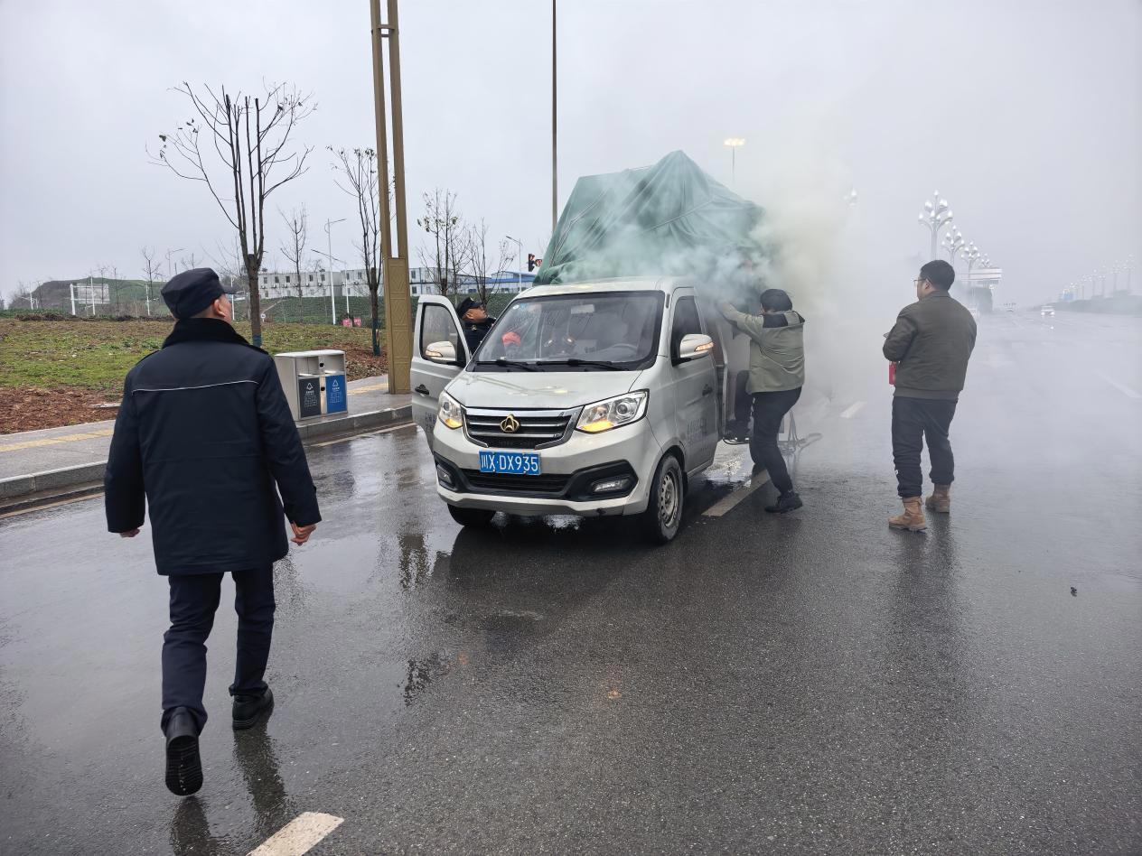 2026年1月20日9时许,广安市岳池县综合行政执法局工作人员在银城大道与龙湖东路十字交叉路口开展日常巡查时,发现路边停放着一辆载满货物的中型货车,其车厢后部正冒出浓烟。
