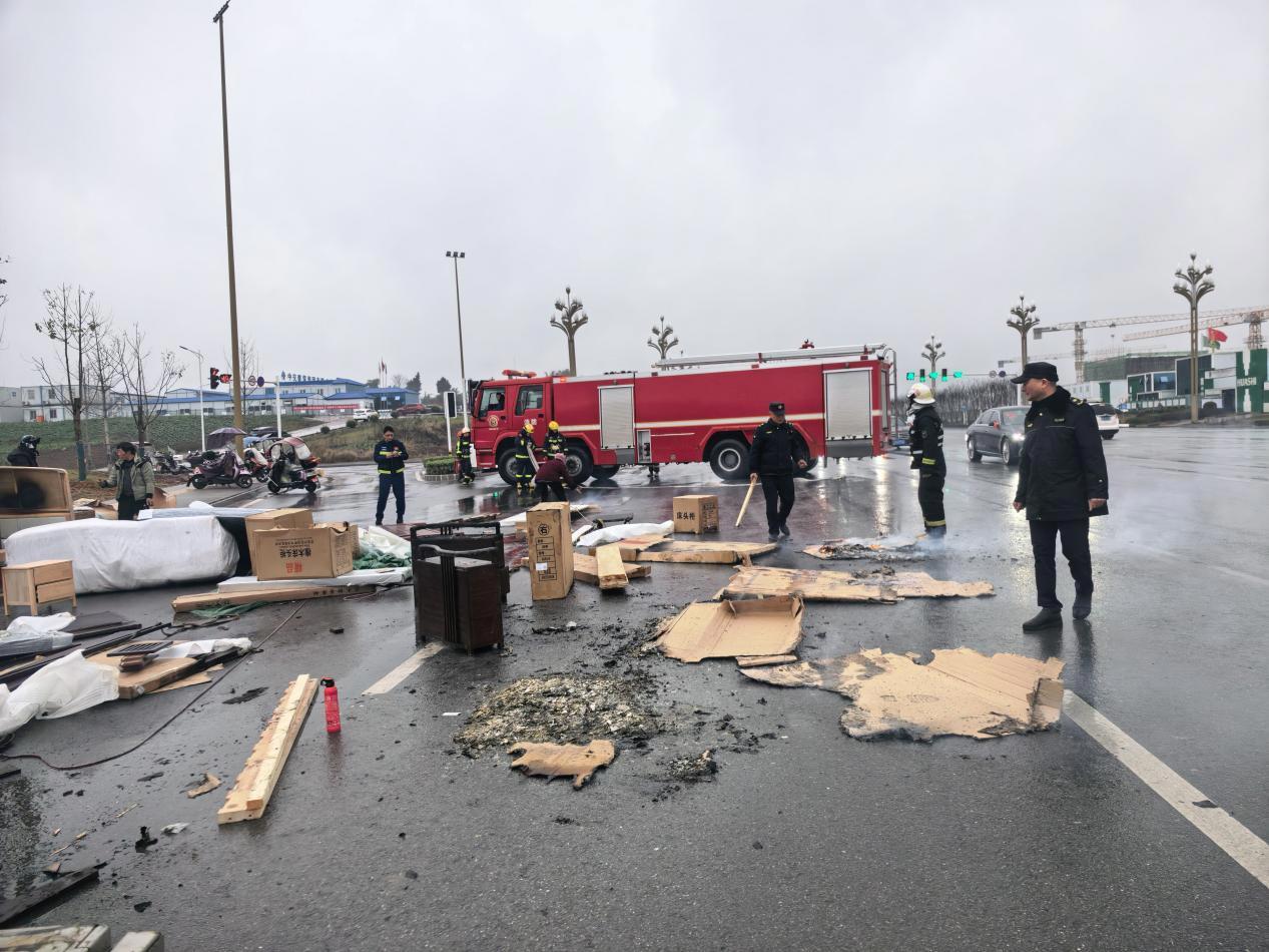工作人员汤振宇一边拨打119报警电话、详细报告现场情况,一边取出干粉灭火器对准货车起火部位进行扑救;另一名工作人员杨红燕则登上货车后厢,协助司机抢救货物。