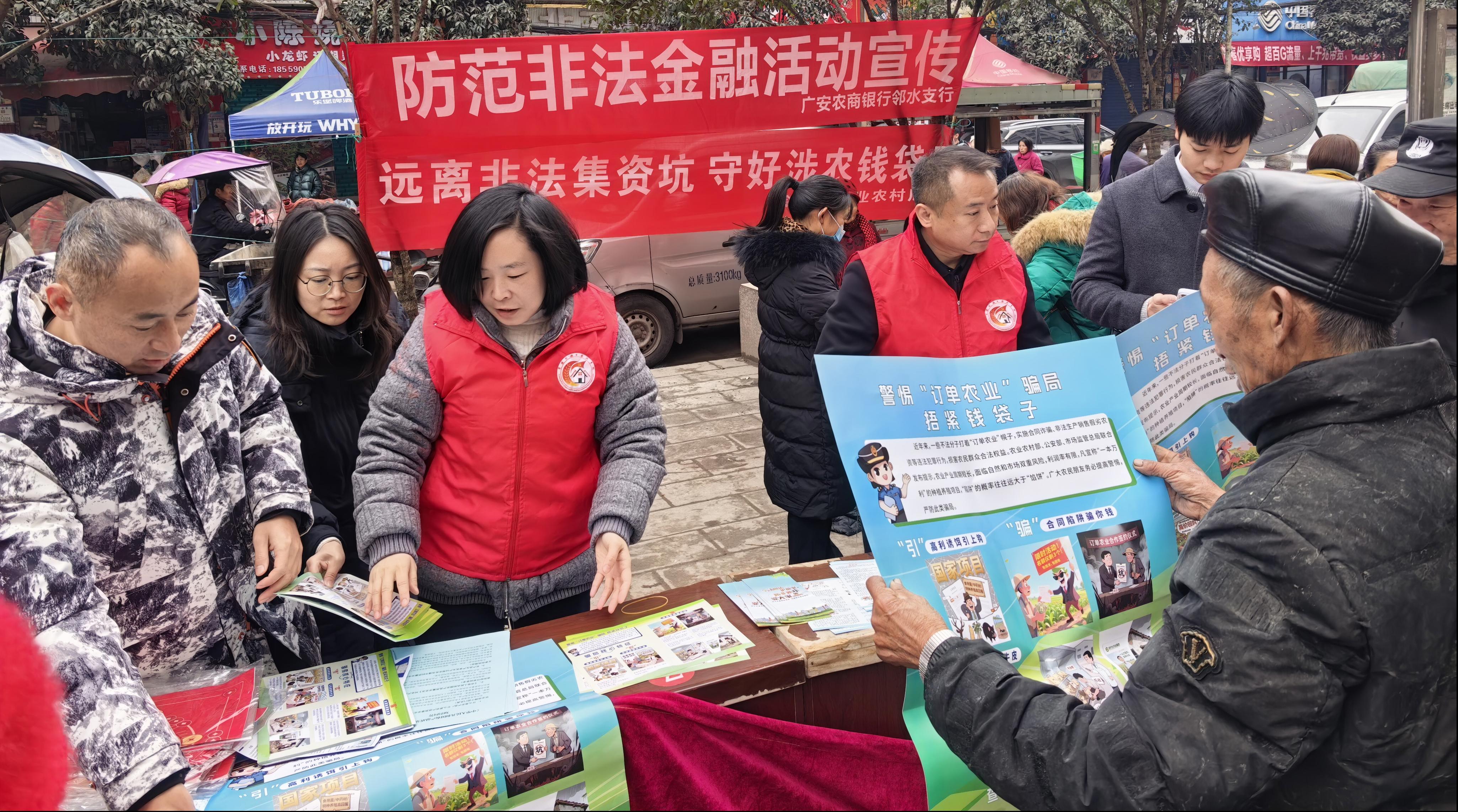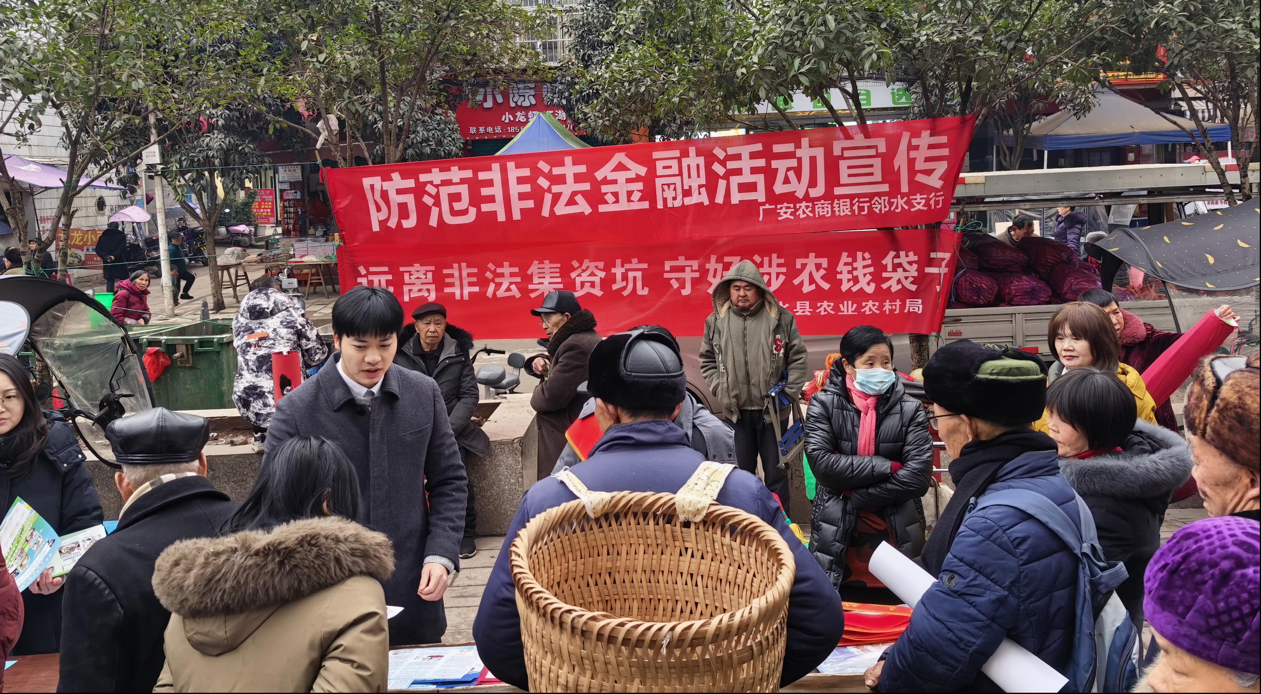 为切实提升农民群众及新型农业经营主体的风险防范意识,守好涉农资金安全,助力乡村振兴,1月22日,邻水县农业农村局联合市农业农村局、九龙镇人民政府、广安农商银行九龙支行,在九龙镇场镇共同开展以“远离非法集资坑,守好涉农钱袋子”为主题的防范非法集资集中宣传活动。