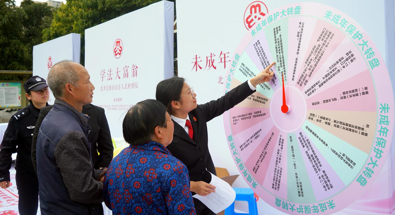 在普法游园环节,由“羌红阿依”团队独家负责的“未成年人保护大转盘”互动点位格外热闹。色彩鲜艳的转盘上,印满与未成年人保护相关的普法小问题,大人小孩纷纷驻足参与,在干警的暖心引导下,转动转盘、回答问题,在欢声笑语中解锁法律知识,在趣味互动中提升自我保护能力,真正实现了“玩中学、学中悟”。