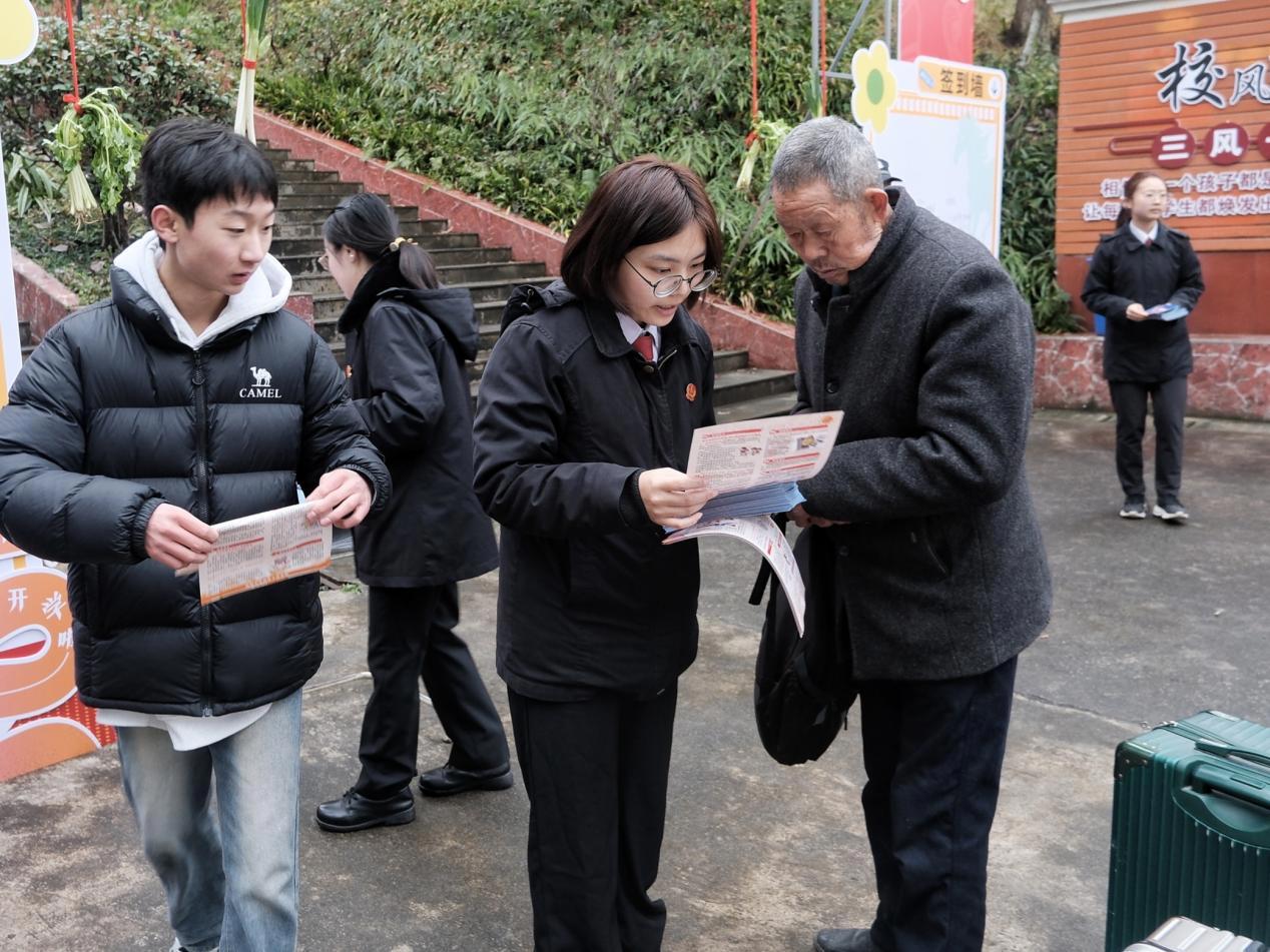 清晨的校园里,法官孙洋和塔水法庭干警将一张张印有未成年人保护和反邪教常识的传单,递到前来报名的同学和家长手中。