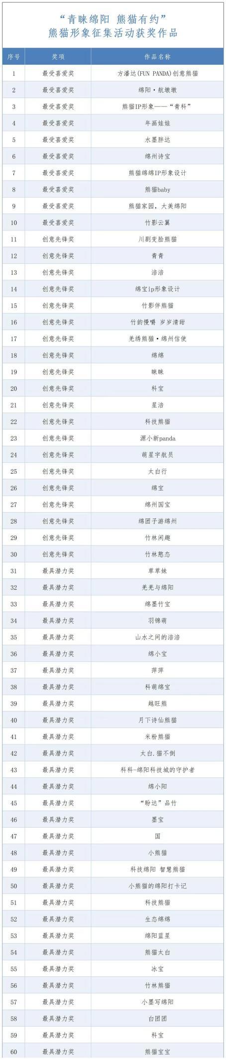 本次活动设置:“最受喜爱奖”“创意先锋奖”“最具潜力奖”共60个名额,获奖作品有望成为绵阳文旅专属IP形象。