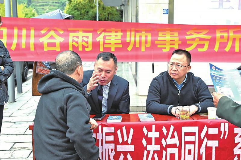 张家荣(右一)在邛崃市夹关镇开展法律免费咨询服务 受访者供图
