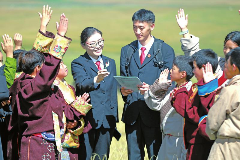 “熊猫绿盾”环资审判团队在草原上开展关于野生动物保护的双语普法课