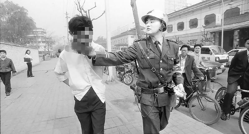 26年前,代明在成都街头押解盗窃嫌疑人。 刘陈平 摄