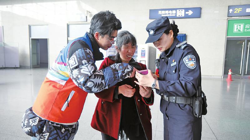 “小时候不懂事,总抱怨,为什么别人的妈妈过年都在家,我的妈妈总要上班?外面放烟花的时候,她总是在车站。”刘兆锐一边低头仔细整理着自己身上那件略显宽大的志愿者马甲,一边有些不好意思地对记者回忆,“后来大一些,知道她是警察,要执勤,但那种理解,还是停留在概念上。直到今年我自己站在这里,亲眼看到她怎么工作。”他的目光投向母亲的方向。那里,郑颖正和同事一起为旅客寻找丢失的背包。