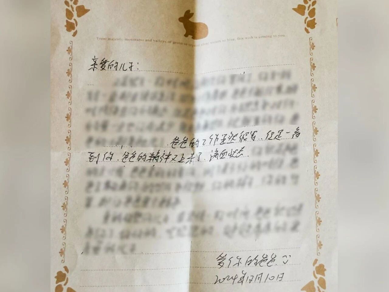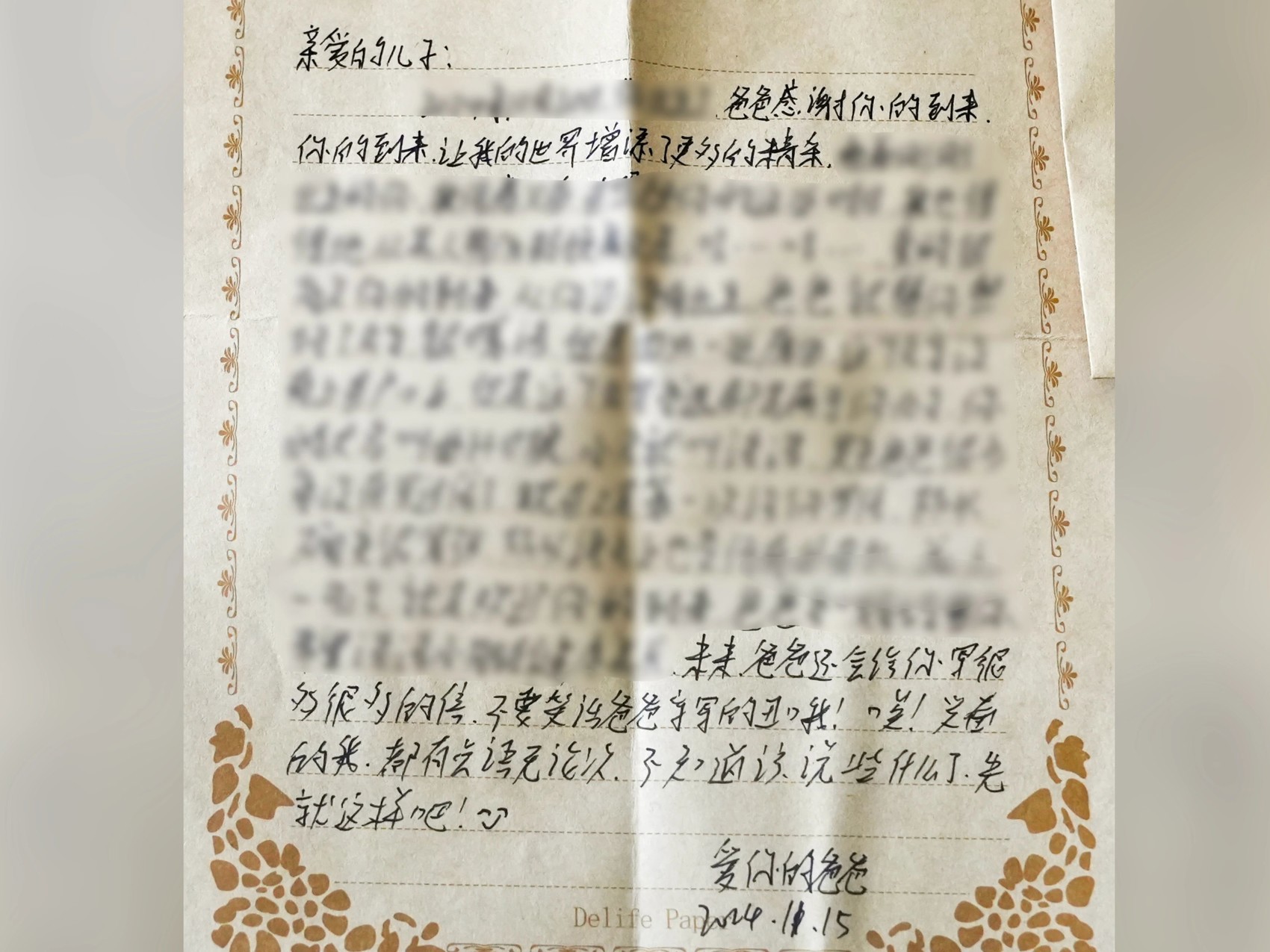 “有很长时间没有给你写信了,因为工作原因,爸爸不能经常陪伴在你身边。爸爸工作虽然很累,但是看见你的照片视频,爸爸的精神又上来了,满血状态。”