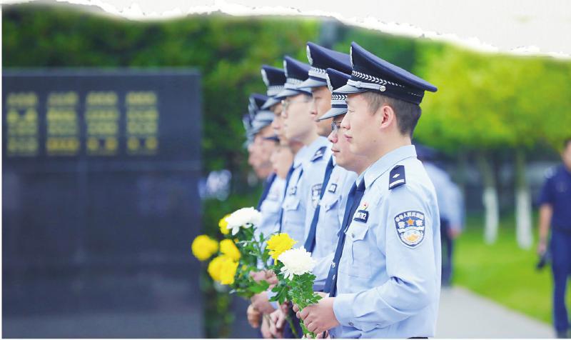 2025年9月30日,烈士纪念日当天,公安民警手持鲜花,在英烈纪念墙前肃立默哀(本报资料图)