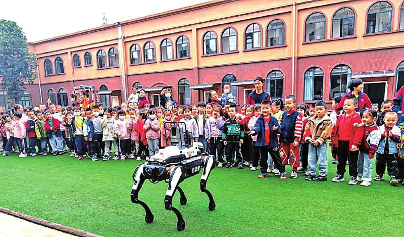 11月5日,绵阳市公安局特巡警支队巡逻四大队联合辖区奇迹爱森幼儿园、绵阳市少年宫幼儿园长虹世纪城分园,开展了一场别开生面的“校园防暴演练暨安全知识讲座”活动。上午9时,奇迹爱森幼儿园内警报骤响,两名“持械歹徒”突然翻越围墙闯入操场,直奔正在活动的孩子们。幼儿园安保人员立即启动一键报警系统,并持防暴器械组成防御阵线。与此同时,巡逻四大队接警后火速抵达现场,随行的智能巡防机器狗迅速进入战斗模式。“放下凶器!立即停止行为!”机器狗通过头部防抖云台锁定目标,同时发出穿透力极强的语音警告。在声波的威慑下,“歹徒”被逼退至墙角。民警与安保人员利用防暴盾牌和钢叉形成战术包围,仅用2分钟便将“歹徒”制服。李亚捷冯兴文/图