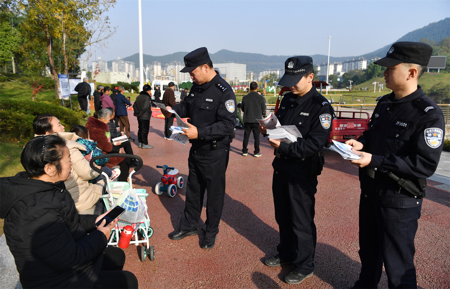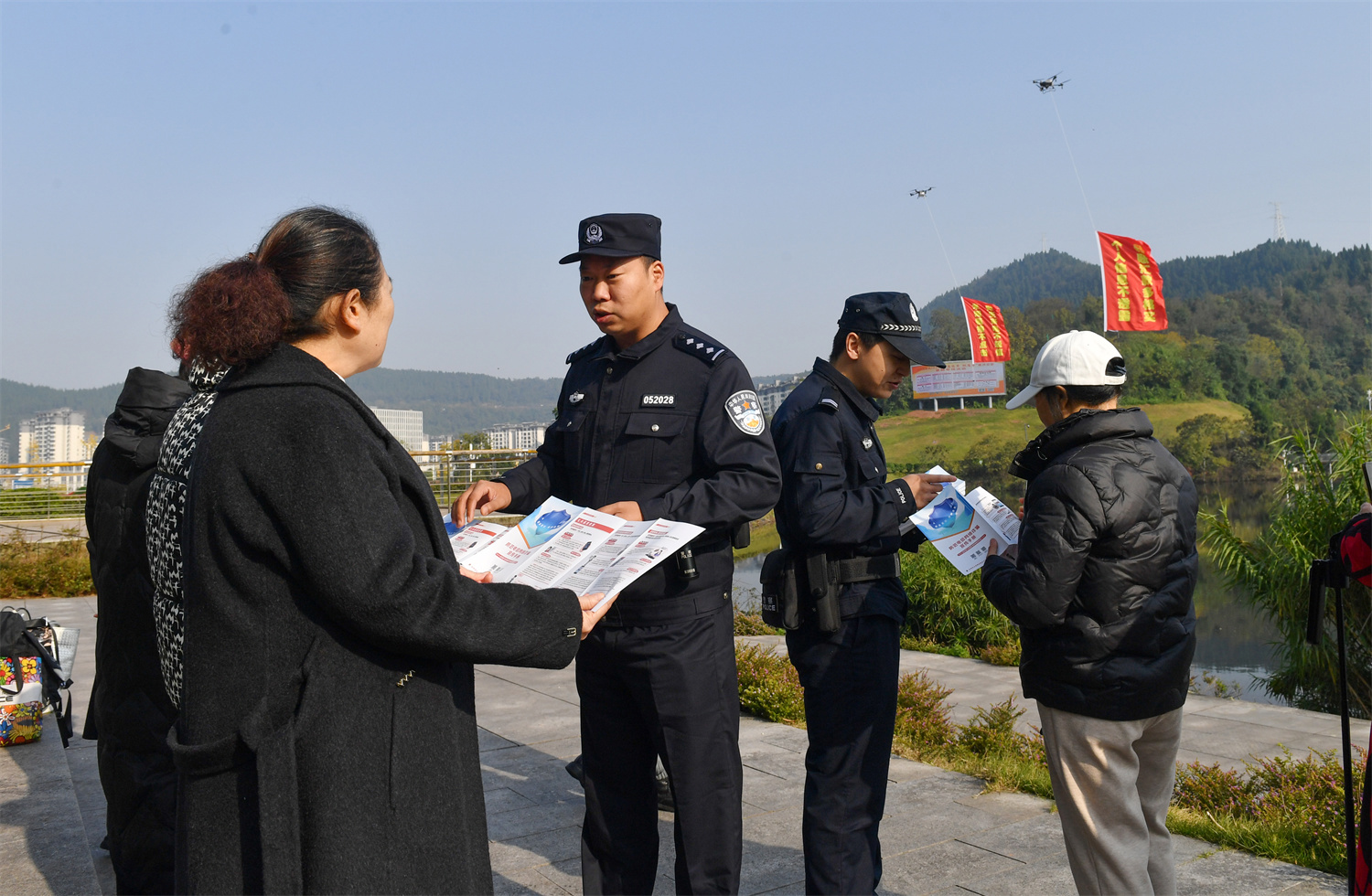 在无人机下方,民辅警同步开展反诈宣传