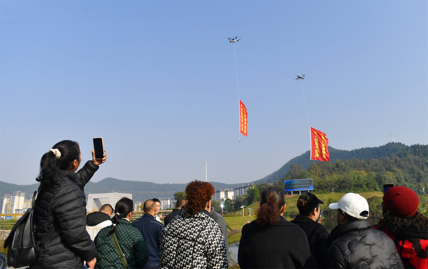 “个人信息不透露 转账汇款多核实”“未知链接不点击 陌生来电不轻信”,近日,在达州市梨树坪湿地公园上空,两架大型无人机悬挂着印有反诈宣传标语的条幅在空中盘旋,向市民宣传防骗反诈知识。这种新颖的宣传方式吸引了不少市民的注意,不少人还拿出手机拍摄,在不知不觉中接受了反诈教育,记住了防骗要点。同时,民辅警在人群中同步开展反诈宣传,他们结合近期高发的电信网络诈骗案例,提醒大家识别诈骗陷阱、保护个人财产安全。