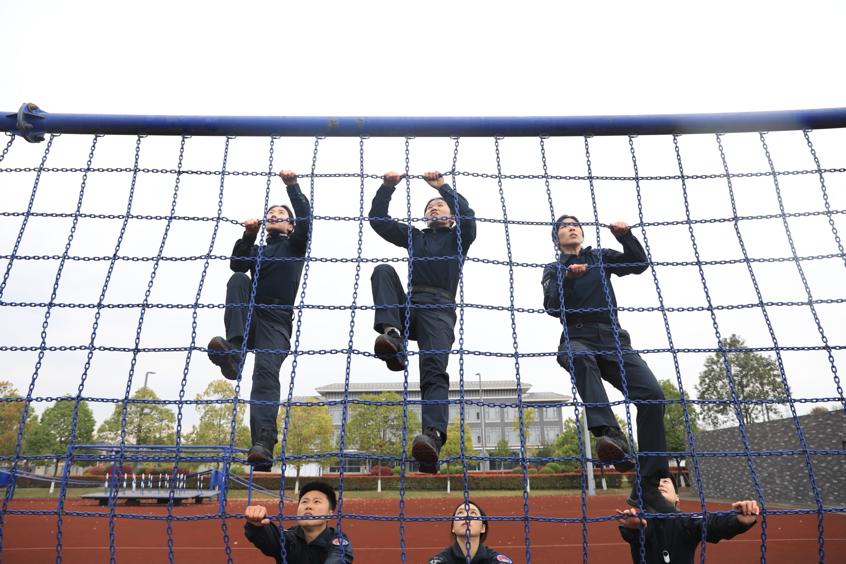 这根绳,还穿过队长沈漪和“00后”队员张钰英肩上扛着的120公斤轮胎,穿过汤犇懿和邹雪攀登冲刺的塔楼;穿过邱宇和柯云倩在极限障碍赛里架起的人形梯。