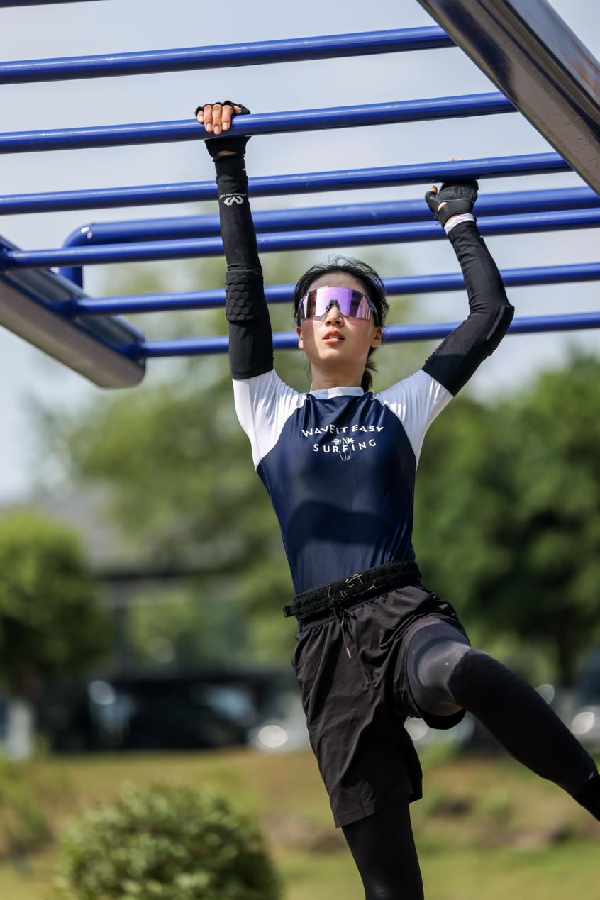 赛场上,协作人梯障碍项目要求队伍必须结成人链同步通过。当位于底座的队员撤离后,整条人链瞬间绷紧,巨大的拉力几乎要将队伍扯断。位于最上方的李封琳,用双手死死绞住铁杆,腰腹如铁锁般收紧。她悬在半空,承受着全队下坠的冲击力,手臂青筋暴起,牙关咬得咯咯响,却始终没有松手,直到最后一名队友安全登顶。