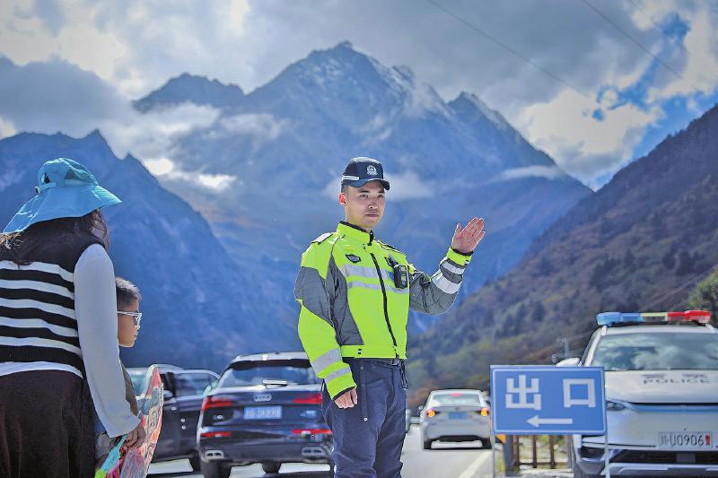 “只要游客能顺利抵达观景点,我们多站一会儿、多讲几句都值得。”在毕棚沟景区警务站,理县公安局执勤交警杨玥一边擦去额头的汗水,一边耐心为游客讲解周边游玩路线。短短十分钟,她回答了七八名游客的询问——从“哪里能拍到雪山倒影”到“哪里有医务室”,这些问题她都对答如流。
