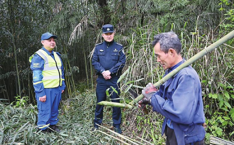 “这片竹林坡度陡,大家巡逻时多留意边角地带,严防盗采滥伐、严查森林火险隐患。”清晨时分,大竹县公安局石河派出所副所长李行便带领民警,联合巴山生态义警队的队员们徒步穿梭于茫茫竹海,逐片排查林区矛盾纠纷、巡查竹林生态安全。深入林间地头、笋农中间,开展生态环境保护、森林防火及反诈知识宣传。