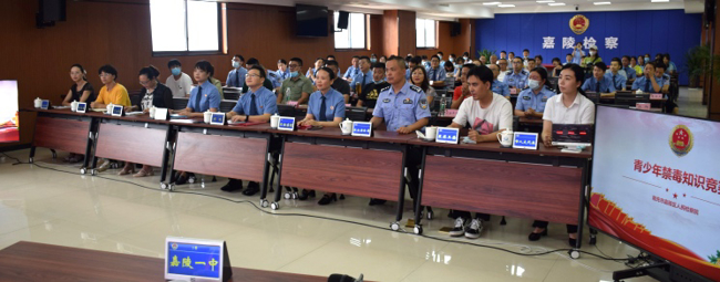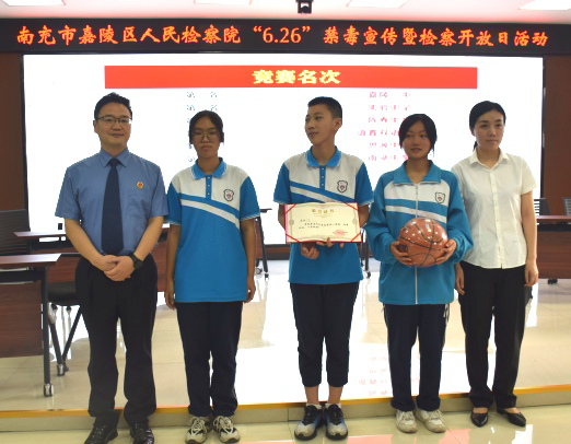 随后,大家来到区检察院六楼的大会议室参加禁毒知识竞赛。嘉陵区院党组成员、分管副检察长张利君致欢迎词后,嘉陵一中、南湖中学、陈寿中学、道鑫双语、实验中学、思源学校等六所中学组织的六支代表队参加了精彩纷呈的禁毒知识竞赛。经过多轮比赛,嘉陵一中代表队脱颖而出,取得了最后的胜利。