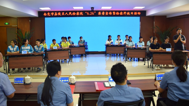 在国际禁毒日来临之际,为进一步巩固法治宣讲进校园活动成果,增强青少年学生抵御毒品的意识和能力,6月22日下午,南充市嘉陵区检察院联合区公安分局开展了内容丰富、形式多样的禁毒宣传活动,嘉陵城区六所中学师生代表,团区委、区妇联、区关工委相关工作负责人,部分人大代表、政协委员、多家媒体记者被邀请参加。