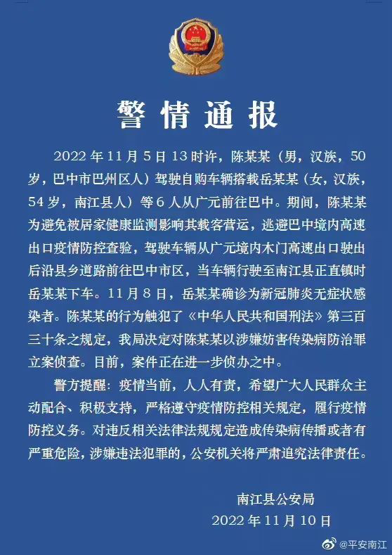 11月10日,四川巴中市南江县公安局发出通报,2022年11月5日13时许,巴中市巴州区男子陈某某驾驶自购车辆搭载岳某某(女,汉族,54岁,南江县人)等6人从广元到巴中。其间,陈某某为避免被居家健康监测影响其载客营运,逃避巴中境内高速出口疫情防控查验,驾驶车辆从广元境内木门高速出口驶出后沿县乡道路前往巴中市区,当车辆行驶至南江县正直镇时岳某某下车。
