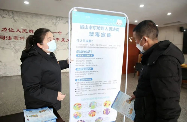 “警惕毒品陷阱,时刻注意防范,您看一下……”春节将至,为充分利用春节期间人员流动的良好契机,进一步营造全民禁毒的浓厚氛围,1月12日,东坡法院在院办事大厅开展禁毒宣传活动。