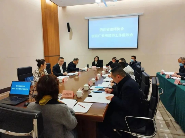 1月10日,四川省律师协会副会长陈军、副监事长冯林一行莅临广安调研律师工作,与广安市律师行业党委委员、市律协副会长、副监事长进行座谈。广安市司法局副局长、市律师行业党委书记梁宁川主持座谈会。
