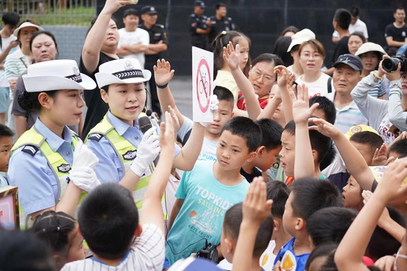 “哇,太酷啦!”“长大后我也要当警察。”英姿飒爽的特警队员向大家展示了“人机犬”协同作战,动作干脆利落,赢得孩子们的欢呼和掌声。随后,民警又跟大家讲解警用装备,耐心细致地介绍了各种先进警用防护装备、特种车辆和枪支警械装备的名称、性能等,小朋友争先与枪械、防爆服等警用装备“亲密”接触,现场气氛十分热烈。