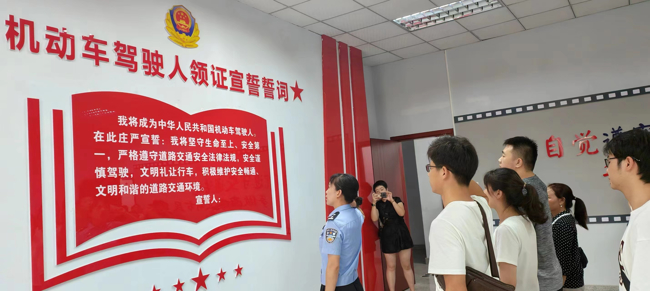 在考场的宣誓室,一位女警官正在带领准驾人员宣誓,高昂的声音在教室里回荡,给人一种严肃的感觉。