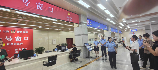 7月27日上午,南充市公安局交通警察支队开展“走进车管所·开启警营体验”活动。10余名中、省、市主流媒体代表受邀参观并体验车管所自助服务区、业务受理大厅、驾驶科目考场,机动车审验中心,传化检测公司等点位,现场体验各类车管业务项目,多项便民服务措施。