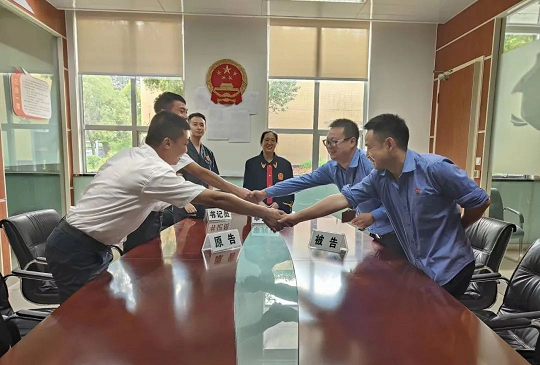 定文人民法庭充分运用“依靠群众、教育群众、尊重群众、方便群众”的诉讼方式,依托网上云法庭、巡回法庭等,实现审判便民,不断提高司法效率。2023年以来,法庭通过网上云法庭开庭、调解案件30余件,案件平均审理天数22.24天,无长期未结案件。同时,定文法庭积极收集汇总辖区内的多发、典型案例,形成统一裁判尺度。在办理物业服务合同纠纷案件时,将社会主义核心价值观融入裁判文书的释法说理中,力促案结事了。此外,法庭通过巡回审判,送法进企业,化解辖区涉企员工的矛盾纠纷,在法官的调解下,当事人双方握手和好,达成了调解协议。