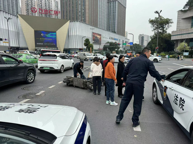 11月8日下午13时左右,成都市青白江区法院法警大队李直蔓、徐旭、付强、吕鹏川四名同志在成都执行警务任务返回青白江途中,在一环路金牛万达广场至龙湖上城天街广场十字路口,遇到一起美团外卖小哥和骑电瓶车男子相撞的交通事故,电瓶车男子倒地无法动弹。