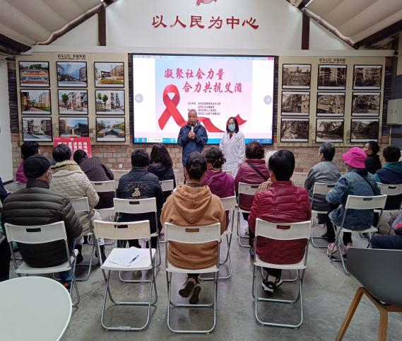 11月16日,由成华区禁毒委员会办公室和成华区卫生健康局主办,成华区第七人民医院承办,成华区二仙桥下涧槽社区协办的以“凝聚社会力量、合力共抗艾滋”为主题的第36个世界艾滋病日宣传进社区活动,在成华区二仙桥下涧槽社区举行。本次活动通过大屏幕滚动播放宣传片,向居民普及艾滋病的基本知识,以及新型毒品与传统毒品的区别,怎样识别毒品,拒绝毒品。期间医务人员以及禁毒社工以有奖问答的形式,让居民参与到禁毒防艾宣传中来,以通俗易懂的语言给居民介绍了精神活性药物,以及滥用药物对身体产生不可逆转的危害的讲解,工作人员向居民发放了艾滋病和禁毒宣传折页和小礼品,成华区疾控中心工作人员为居民介绍了艾滋病的基本概念、分期、传播途径和日常生活中应该注意的预防方法,成华区第七人民医院的医生着重强调了新型毒品与艾滋病之间的关系,旨在提高广大群众远离高危行为的意识。期间,社区负责人还向社区居民强调冬季注意保暖,不聚集在人多的地方,勤洗手,做自己健康第一责任人。