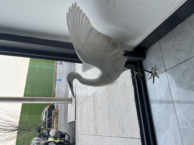 到达现场后,民警发现一只身形修长、羽毛洁白如雪、嘴巴尖而长的大鸟躲在墙角,扑哧着它的翅膀。经民警初步辨认,这只白色大鸟为国家二级保护动物白鹭。检查中,民警发现白鹭嘴角破裂,无其他明显外伤。