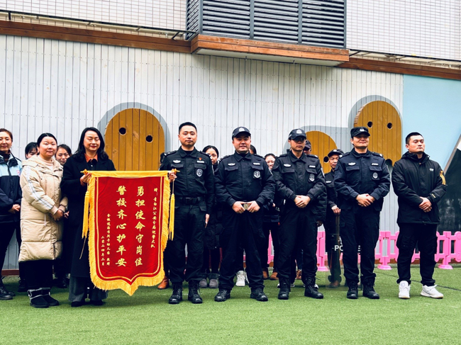 金橄榄幼儿园为巡警大队送上印有“勇担使命守岗位警校齐心护平安”的锦旗,感谢巡警大队近年来对金橄榄幼儿园的平安守护。