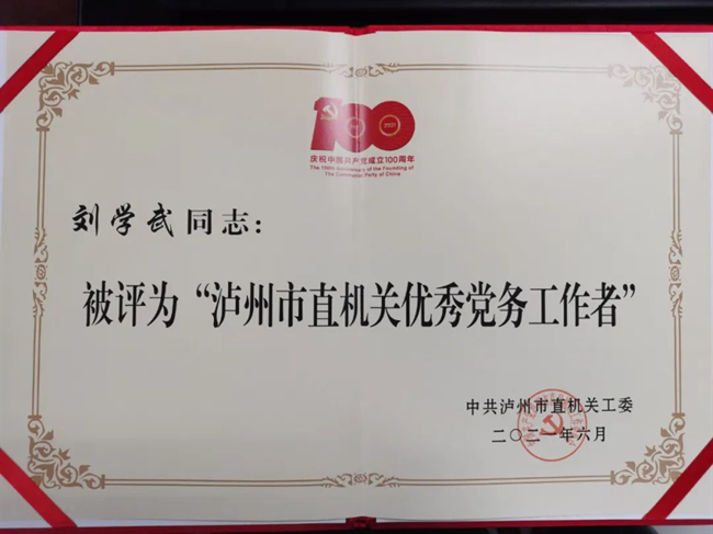 刘学武,现任泸州中院机关第一党支部组织委员,三级法官。先后获得“泸州市直机关优秀党务工作者”“泸州中院优秀共产党员”等荣誉称号。