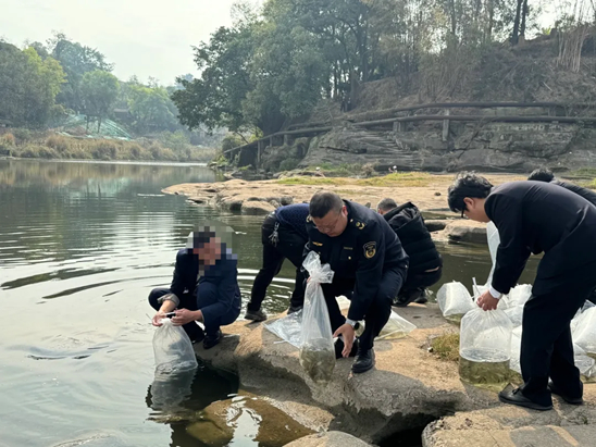 两地法院在贡井区艾叶滩举行“生态修复增殖放流点”揭牌仪式。并见证被告人曹某、刘某某、毕某某犯非法捕捞水产品罪刑事附带民事公益诉讼案履行增殖放流义务活动,现场向旭水河放流鲢鱼育苗6000余尾。
