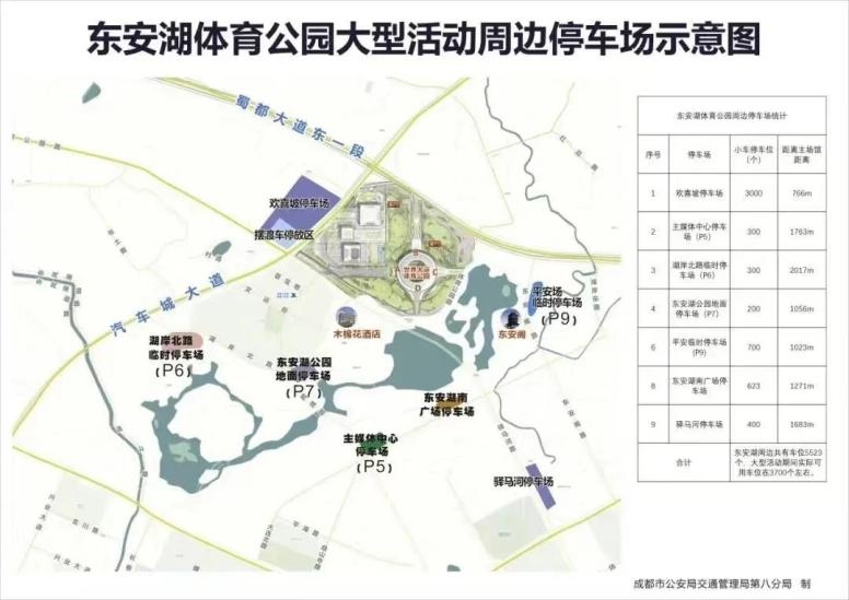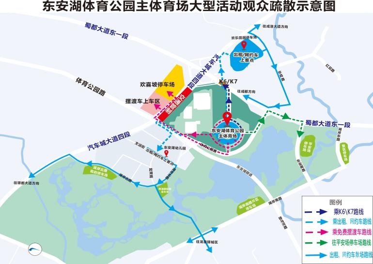 6、汽车城大道三段西侧辅道临时停车区:车头朝南,散场时车辆经汽车城大道东安湖下穿或蜀都大道东一段疏散。