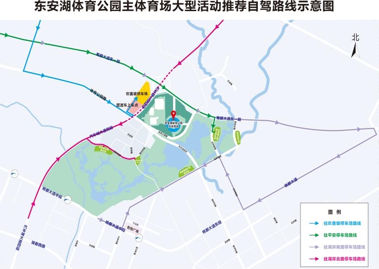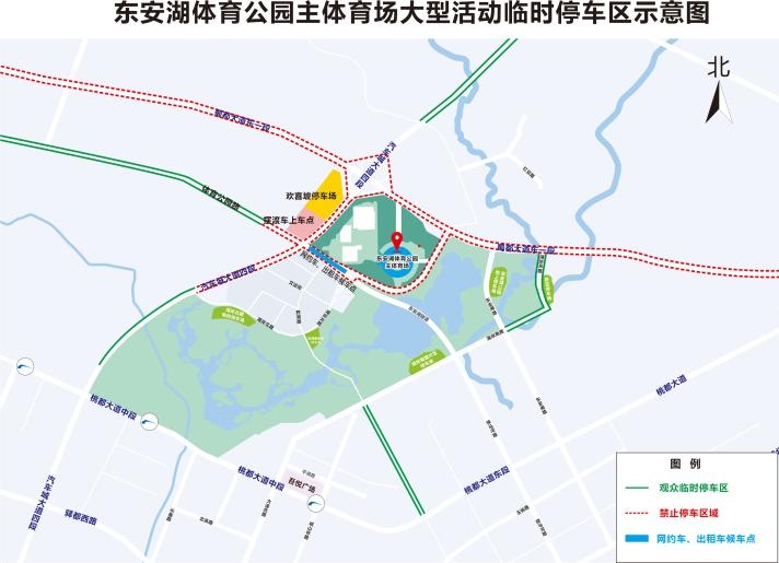 5、汽车城大道四段(龙兴路口以北)西侧辅道临时停车区:车头朝南,散场时车辆经汽车城大道→驿都大道或成龙大道疏散。