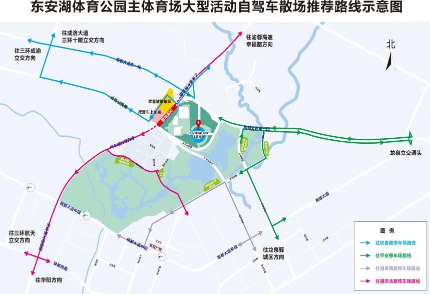 1、湖岸东路临时停车区:道路两侧单排顺向停放,车头一致,散场时经蜀都大道东一段→龙泉立交疏散。