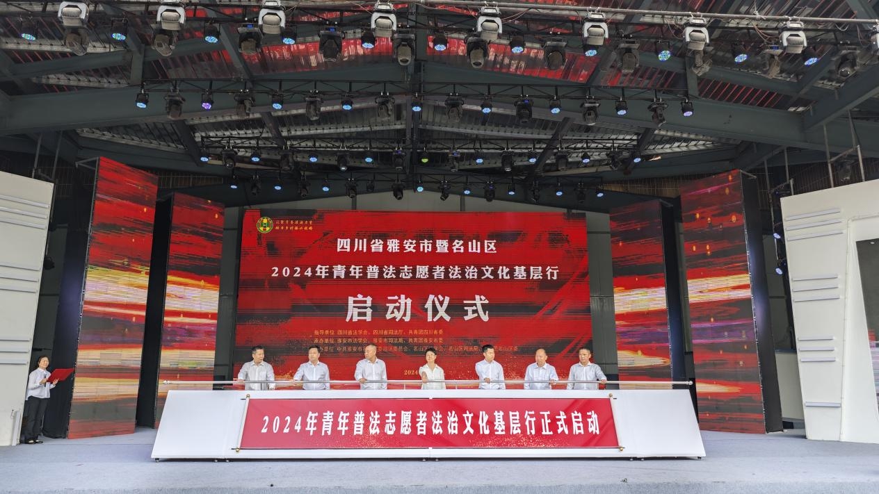 5月10日,雅安市暨名山区“2024年青年普法志愿者法治文化基层行”活动启动仪式在名山蒙山茶苑广场举行。省法学会党组成员、秘书长王自清,市委政法委副书记王强,共青团雅安市委裴胜军,市司法局副局长羊平,名山区委常委、政法委书记廖春雷及相关单位负责人,100名青年普法志愿者参与启动仪式。市法学会专职副会长张敏主持启动仪式。