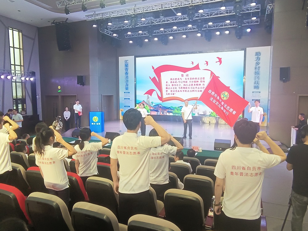 “我自愿成为一名光荣的普法志愿者,尽己所能,不计报酬,服务社会、服务他人为建设更高水平的法治自贡贡献自己最大的力量.....” 5月10日上午9:30,在自贡成都外国语学校演艺厅,面对青年普法志愿者旗帜,十多名青年普法志愿者代表庄严宣誓。