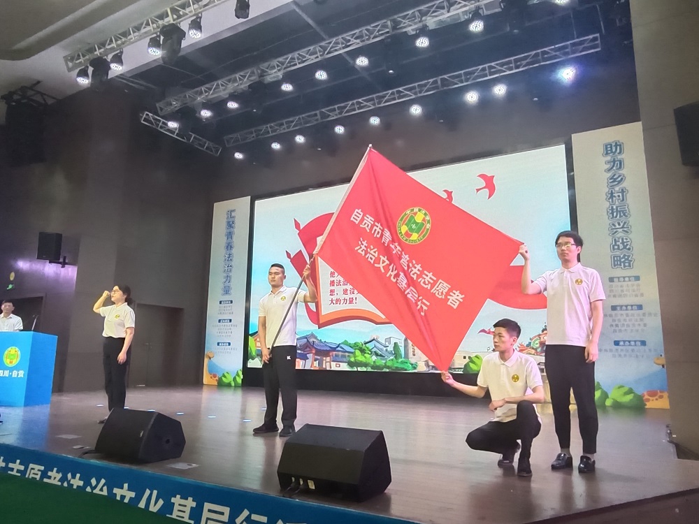 宣誓仪式结束后,自贡市人大常委会副主任吴兰向青年普法志愿者授旗。
