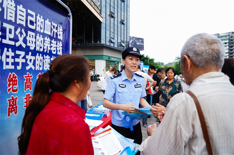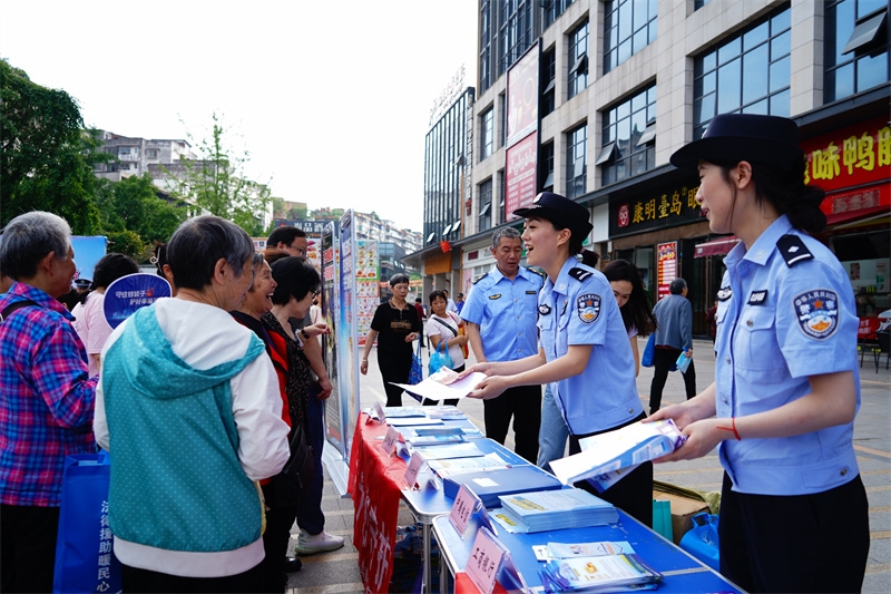 5月15日,在第十五个全国公安机关打击和防范经济犯罪宣传日当日,在自贡市贡井区的繁华街头,一群警花头顶烈日,细致耐心地向过往群众宣传防范经济犯罪的意识和能力。