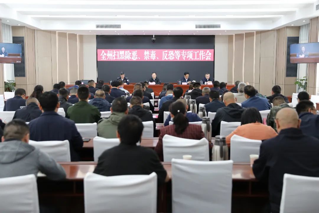 会议以电视电话会议形式召开。州扫黑除恶斗争领导小组、州禁毒委、州反恐怖工作领导小组、州打击整治侵害未成年人违法犯罪专项行动领导小组成员单位负责同志,州扫黑办、州禁毒办、州反恐办全体成员和州级政法各单位分管负责同志在主会场参加会议。
