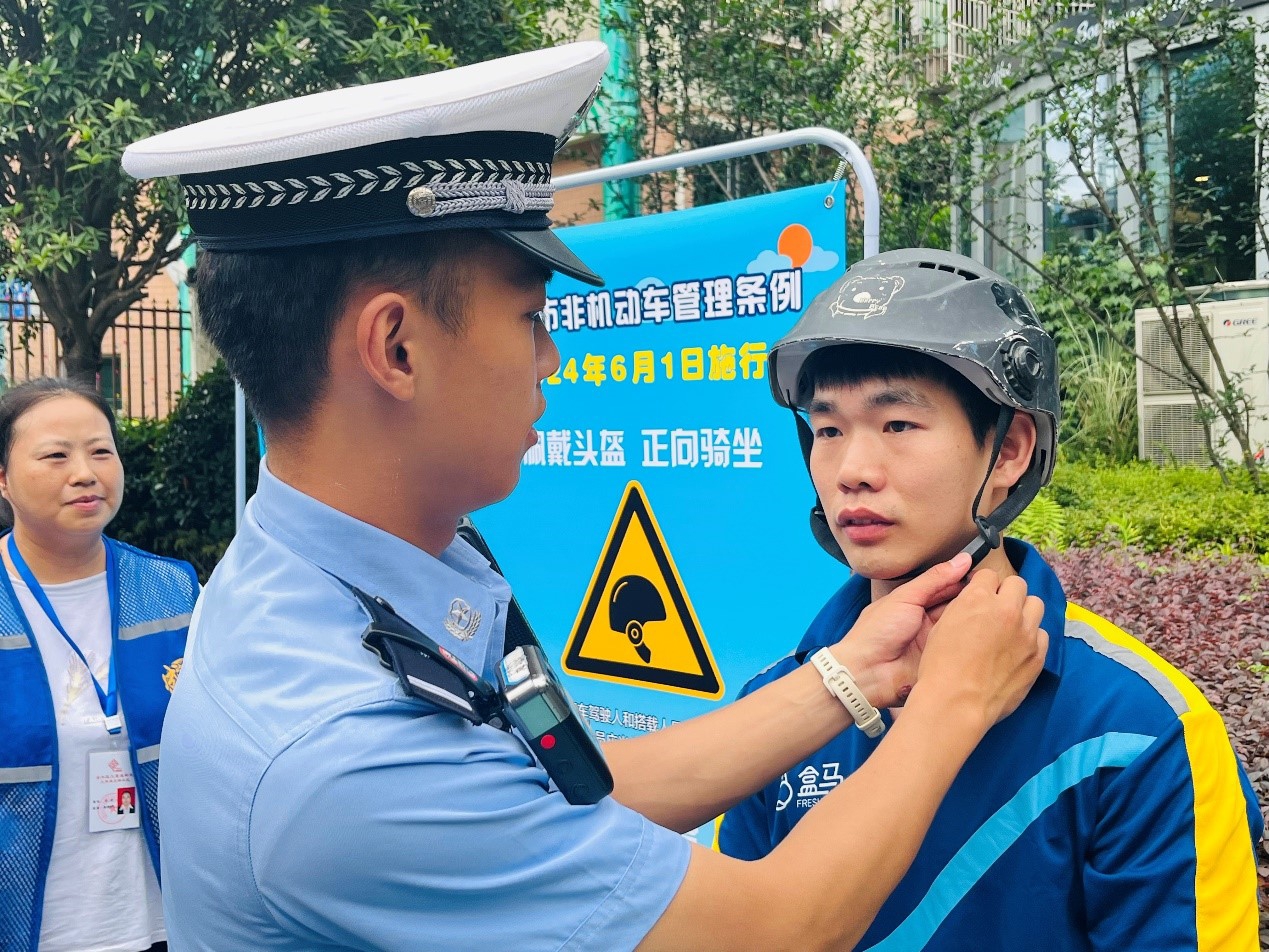 宣讲活动结束后,交警二分局民警刘元志和社区网格员一起深入居民院落门口,对骑行电动自行车的居民群众开展宣讲和现场劝导。交警和网格员耐心地向每一位过往的群众讲解《成都市非机动车管理条例》的相关规定,提醒他们务必佩戴安全头盔、不在骑行过程中使用手机、切勿酒后驾驶等,对于未佩戴安全头盔的居民,刘警官和社区网格员进行了现场劝导。