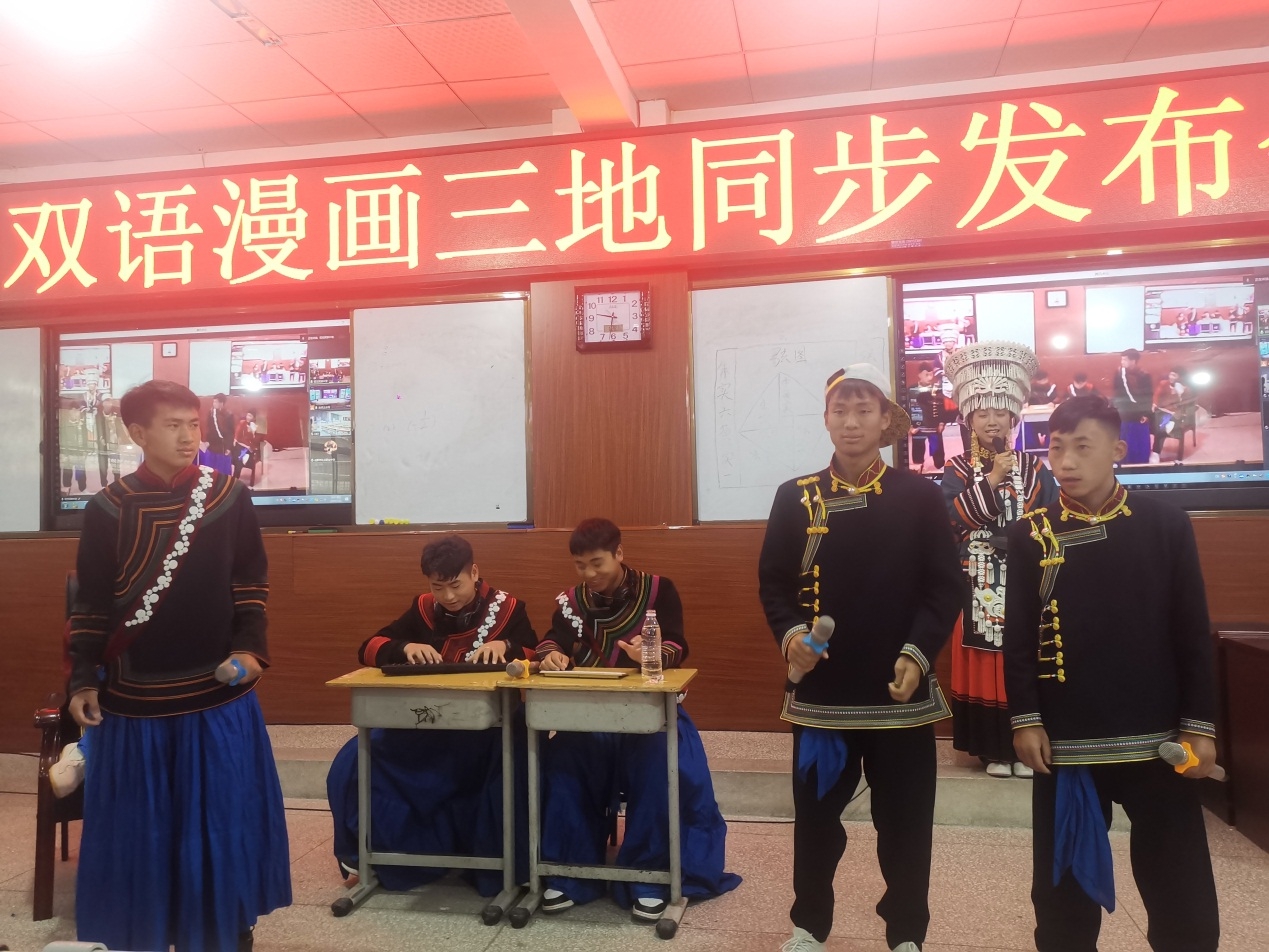 发布会介绍了武侯区青少年法治教育工作的举措和成效,并立足武侯聚齐56个民族的多民族融合特点,希望藏汉、彝汉漫画的发布以法治之光照亮少数民族学生学法之路,浇灌民族团结进步之花。活动中,主会场武侯区检察院“亮晶晶+武侯•星火”未检团队携手“检锦百花”促进民族团结进步团队连线白玉县、昭觉县分会场,邀请藏族、彝族小朋友进行藏语和彝语漫画故事表演,“沉浸式”体验民族文化和法治漫画的魅力。最后,参会领导向同学们赠送漫画和法治礼品,激励小朋友们尊法、学法、守法、用法,争当法治小先锋。