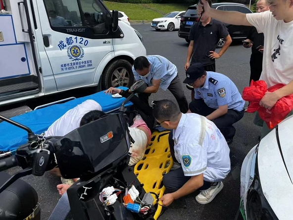 几分钟后,医护人员到达现场。在查看伤情后,医生对女子的伤口进行了包扎处理,随后,民警协助医护人员将女子送上救护车,在现场交通秩序恢复后,民警又继续开展巡逻工作。