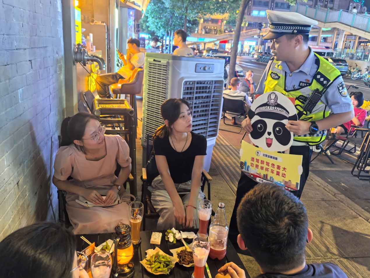 为进一步加强酒醉驾源头管理,9月27日,民警以辖区九眼桥小酒吧一条街为宣传阵地,开展“拒绝酒驾 平安出行”主题交通安全宣传活动,在就餐高峰时段,面对面地与就餐群众、酒吧餐馆经营者“拉家常”“聊安全”,温馨提醒大家牢固树立“开车不喝酒 喝酒不开车”安全理念,时刻绷紧交通安全“弦”。成都交警温馨提示:国庆假期将至,请大家在出行、旅游的同时,不忘交通安全,拒绝酒驾,从我做起,提醒身边人,监督身边事,喝酒不开车,开车不喝酒,文明守法,平安出行,度过一个愉快、平安、和谐的假期。