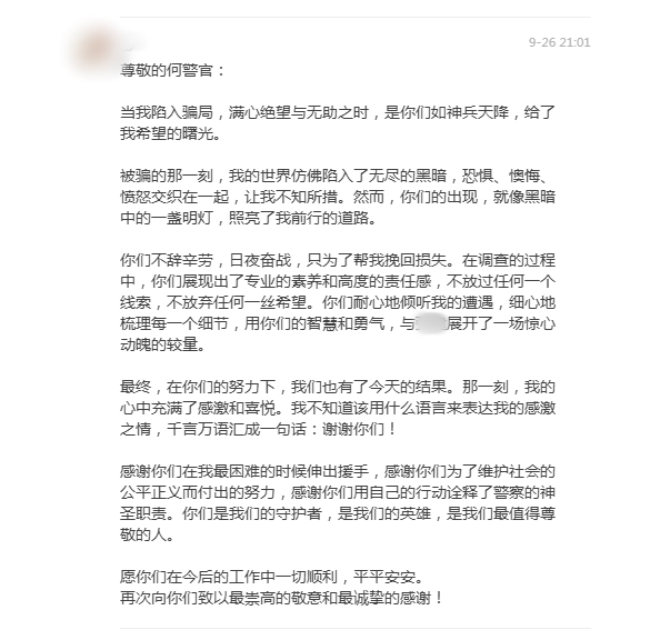 9月26日,经成都市新津区人民法院审判,张某因犯诈骗罪被判处有期徒刑七年八个月。当日,受害学生梁某也是怀着激动的心情向该案的主办民警何继川发来长篇感谢信表达了满满的敬意。